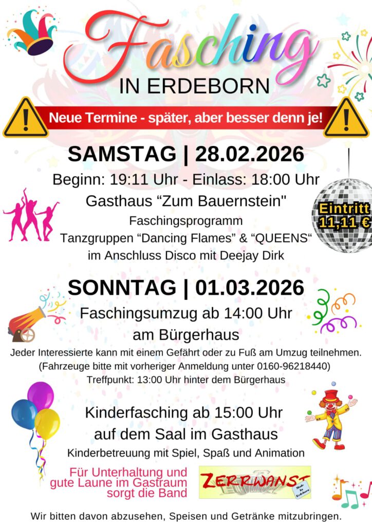 Wie jedes Jahr fängt für uns die Auftrittssaison mit dem Fasching in Erdeborn an. Nach dem Umzug könnt Ihr uns wieder live im Bauernstein hören und sehen. Dieses Jahr allerdings nicht wie gewohnt am Faschingssonntag, sondern erst am Sonntag, den 1.3.
